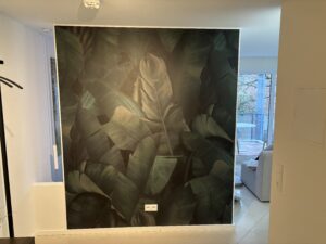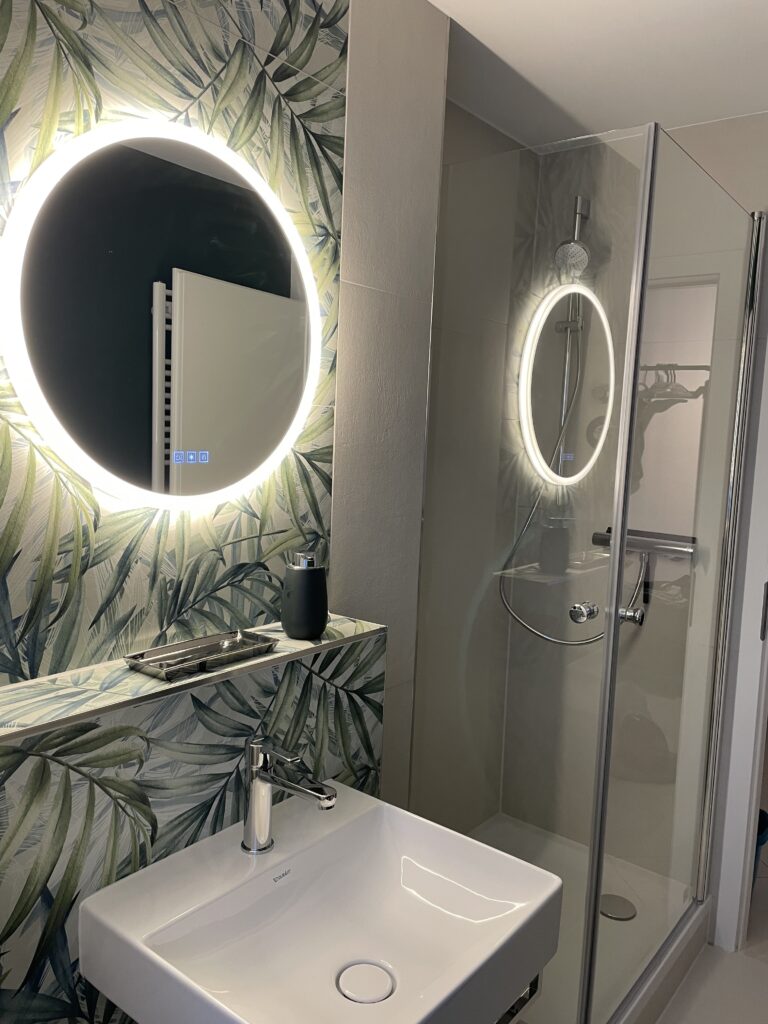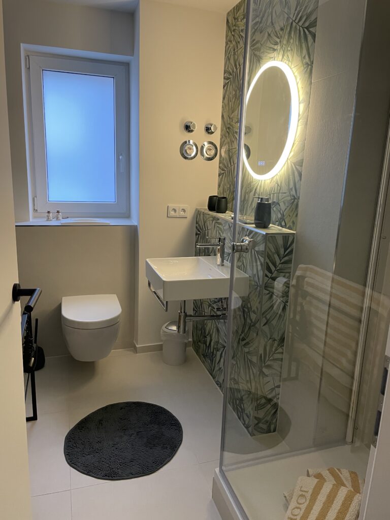 Das Badezimmer besticht durch ein großes Fenster, geschmackvolle Fliesen mit Palmenmotiven in einem entspannten Grünton und einer einladenden Atmosphäre – der perfekte Ort, um den Tag erfrischt zu beginnen oder entspannt ausklingen zu lassen.