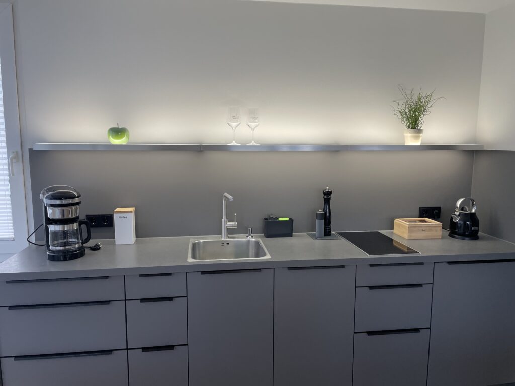 Der stilvolle Wohnbereich mit voll ausgestatteter Küche überzeugt mit modernen, hochwertigen Möbeln und einer exklusiven Küche, die mit allem versehen ist, was Sie für einen unbeschwerten Aufenthalt benötigen.