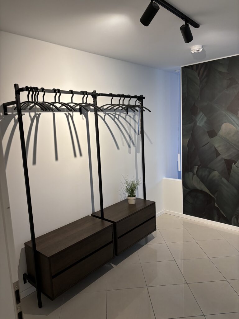 In dem hellen Eingangsbereich erwartet Sie ein modernes Rackbuddy-System, ein praktisches und stilvolles Stauraumkonzept, das als offener Kleiderschrank dient. Es kombiniert Funktionalität mit zeitlosem Design und bietet ausreichend Platz für Ihre Kleidung und Accessoires.