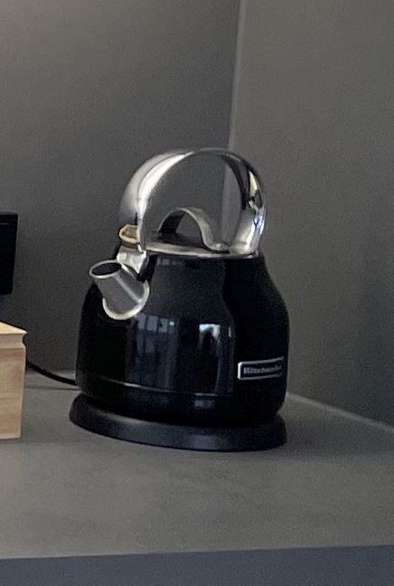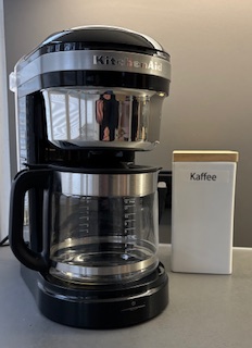 Ein Ceranfeld, Kühlschrank, Geschirrspüler sowie eine Kaffeemaschine für Kaffeepulver, ein Wasserkocher und ein Toaster der Marke KitchenAid stehen Ihnen zur Verfügung.